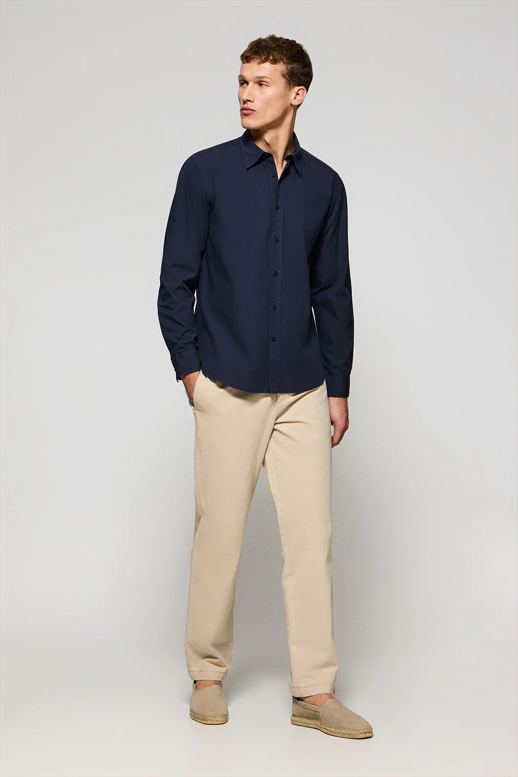 Nuestra camisa regular para hombre combina a la perfección, estilo, sofisticación y funcionalidad. Confeccionada en suave popelín de algodón con tratamiento garment dye es ideal para el día a día o eventos casuales. Su cuello francés añade un aire sofisticado. El piping en el interior del cuello tintado del color de la prenda y los detalles en las costuras laterales añaden un toque sofisticado sin perder el estilo clásico. Los botones logotipados y el último ojal cosido en horizontal son detalles de un diseño refinado y meticuloso. El emblemático logo bordado Rigby Go en el pecho le añade un toque distintivo.