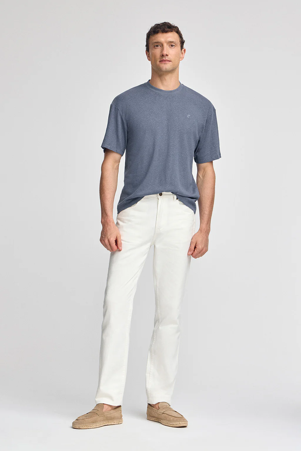 Camiseta azul denim en lino y algodón de cuello redondo y monograma bordado