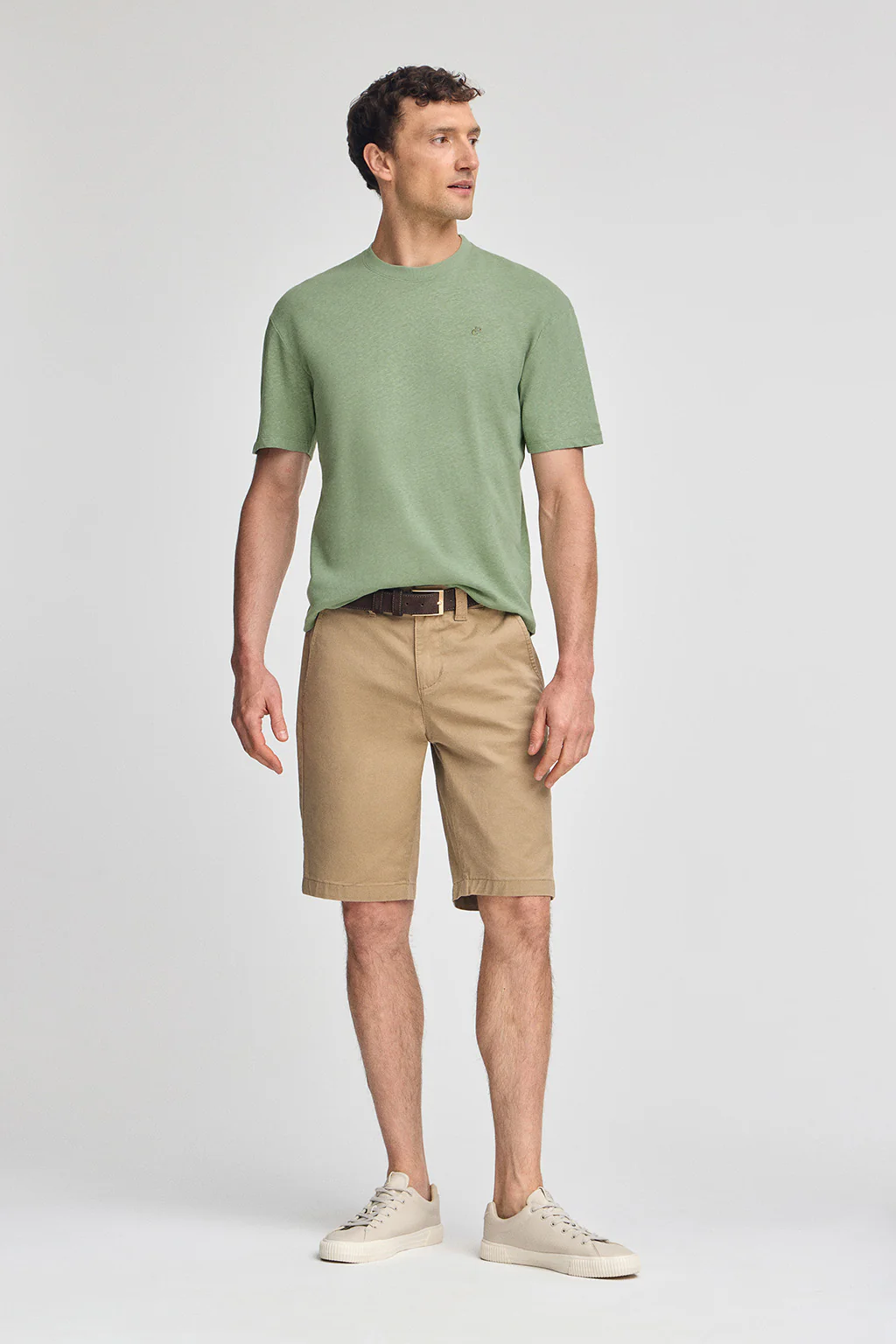 Camiseta verde jade en lino y algodón de cuello redondo y monograma bordado