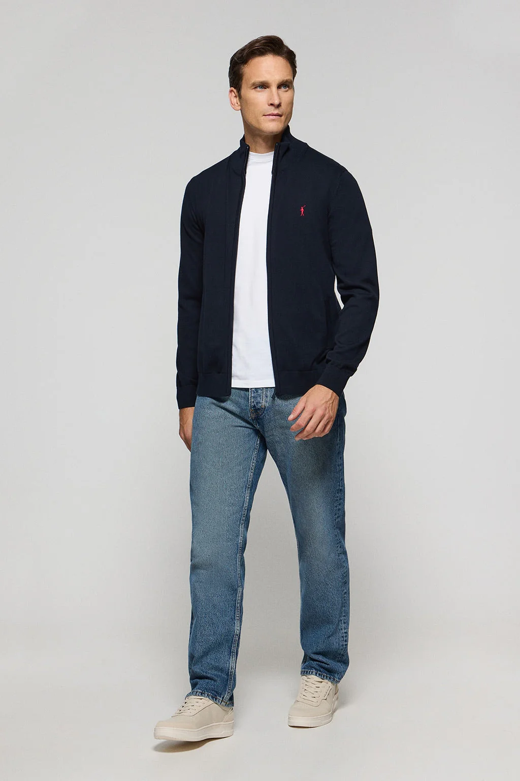 Nuestro cárdigan de cremallera para hombre define la calidad y el estilo. Confeccionado en algodón de tricot, cuenta con un cuello elevado cuando lo cierras que ofrece un look elegante y moderno. Los detalles acanalados en el cuello, las mangas y el bajo ofrecen un ajuste perfecto y un acabo pulido. Sus dos bolsillos laterales ofrecen comodidad y practicidad. El sutil detalle de tapacosturas en el cuello azul marino con el logo grabado Polo Club, acompañan la elegancia de este cárdigan. Bordado icónico de nuestro logo Rigby Go a color contraste en el pecho. Una prenda versátil y elegante que podrás acompañar con un pantalón chino o un vaquero.