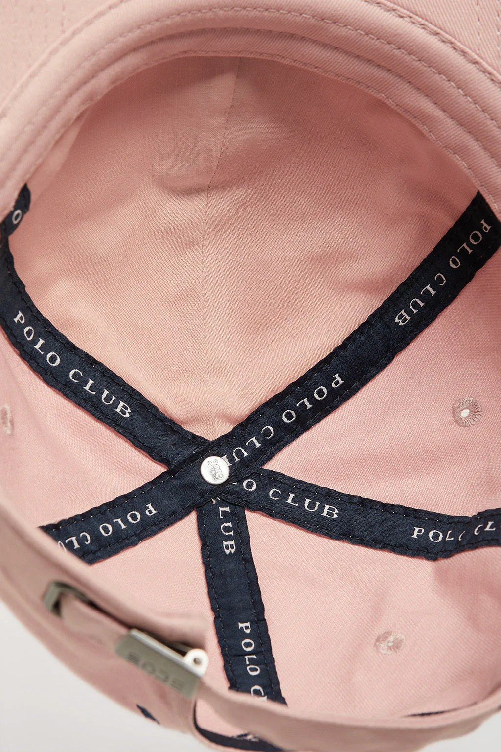 Gorra de seis paneles, confeccionada en sarga de algodón. Presenta sistema de ajuste y hebilla trasera con grabado Polo Club. Diámetro ajustable entre 50 y 60 cm. Cinta logotipada en costuras interiores y detalle de etiqueta Polo Club. Visera pre-curvada. Logo bordado en contraste Rigby Go.