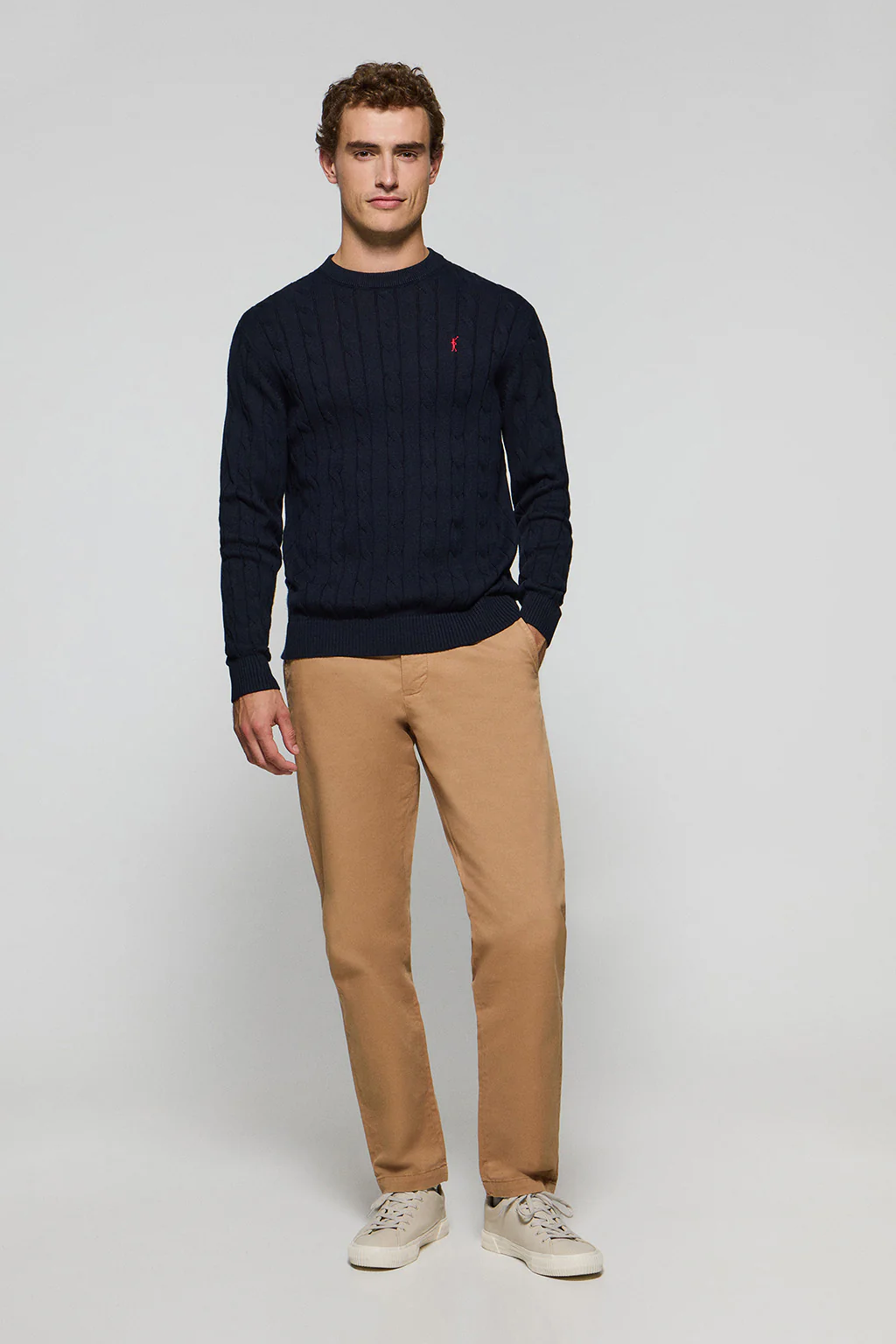 Jersey de punto trenzado azul marino con logo Rigby Go