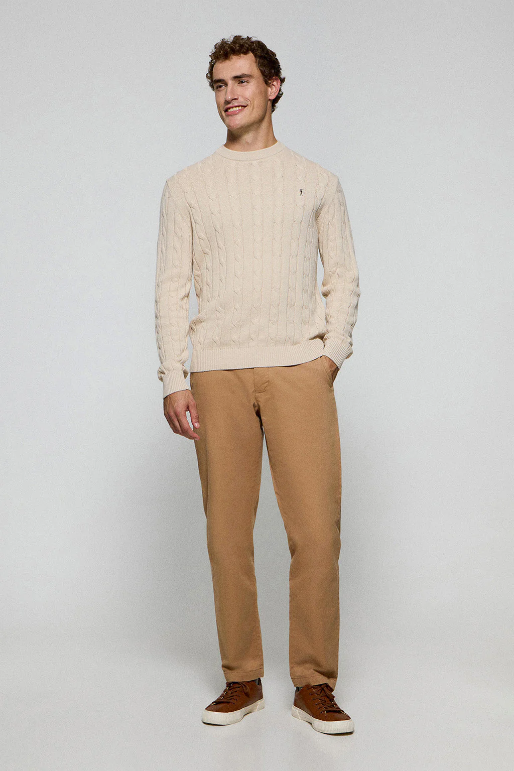 Nuestro jersey de algodón trenzado para hombre destaca por su diseño. El patrón trenzado añade una textura sofisticada y única. Los detalles acanalados en el cuello, las mangas y el bajo ofrecen un ajuste perfecto y un acabo pulido. El sutil detalle de tapacosturas en el cuello azul marino con el logo grabado Polo Club, acompañan la elegancia de este jersey. Bordado icónico de nuestro logo Rigby Go a color contraste en el pecho. Esta prenda es perfecta para quienes buscan una combinación de confort y estilo.