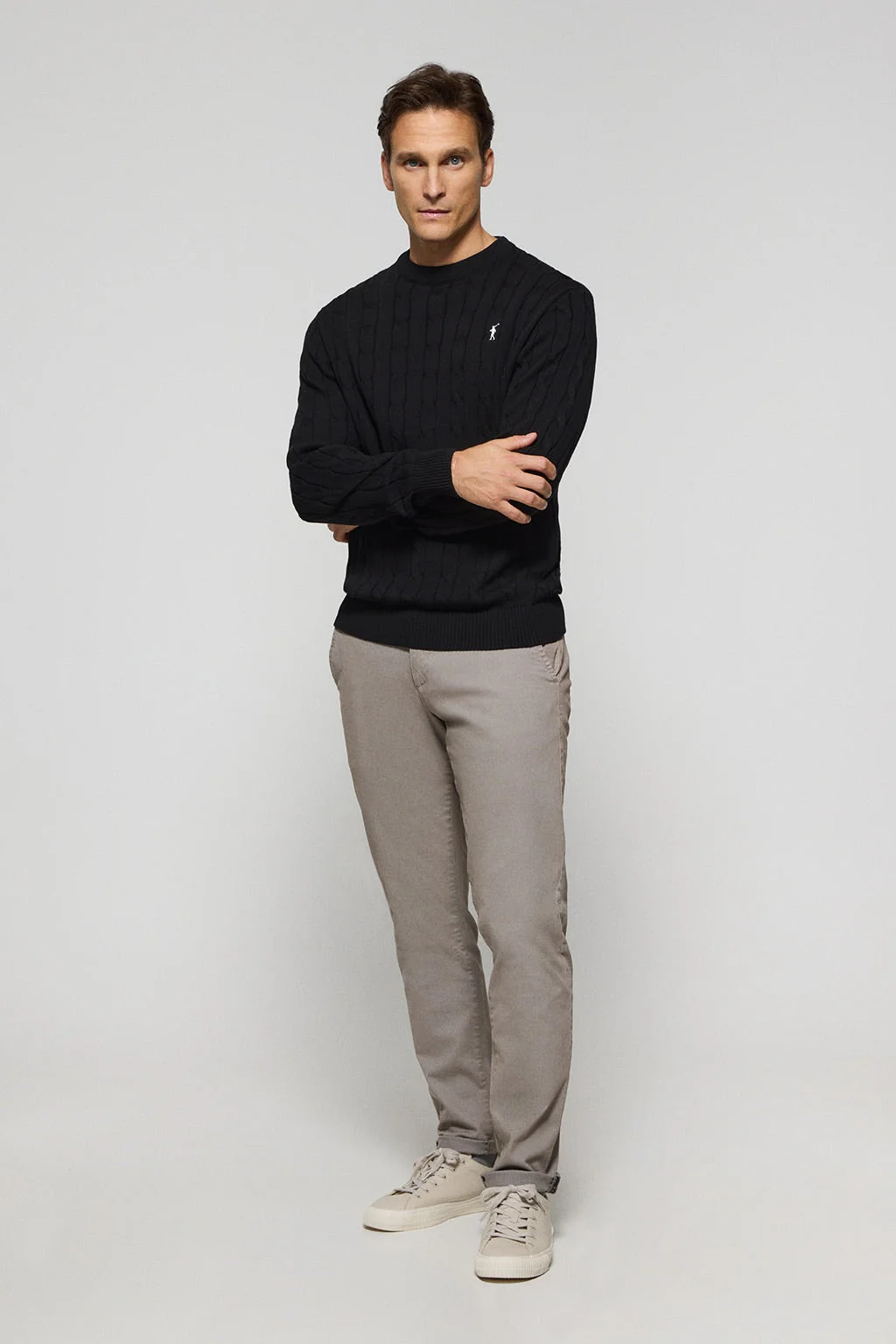 Nuestro jersey de algodón trenzado para hombre destaca por su diseño. El patrón trenzado añade una textura sofisticada y única. Los detalles acanalados en el cuello, las mangas y el bajo ofrecen un ajuste perfecto y un acabo pulido. El sutil detalle de tapacosturas en el cuello azul marino con el logo grabado Polo Club, acompañan la elegancia de este jersey. Bordado icónico de nuestro logo Rigby Go a color contraste en el pecho. Esta prenda es perfecta para quienes buscan una combinación de confort y estilo.